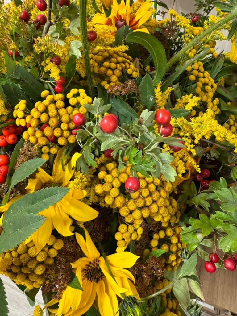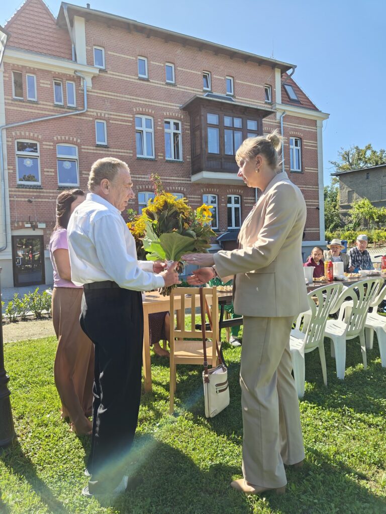 Spotkanie zakończyło się wspólnymi zdjęciami i symbolicznym podziękowaniem dla Pani Prezydent za jej czas dla seniorów poprzez wręczenie bukietu polnych kwiatów, wykonanego przez mieszkańców w ramach hortiterapii.