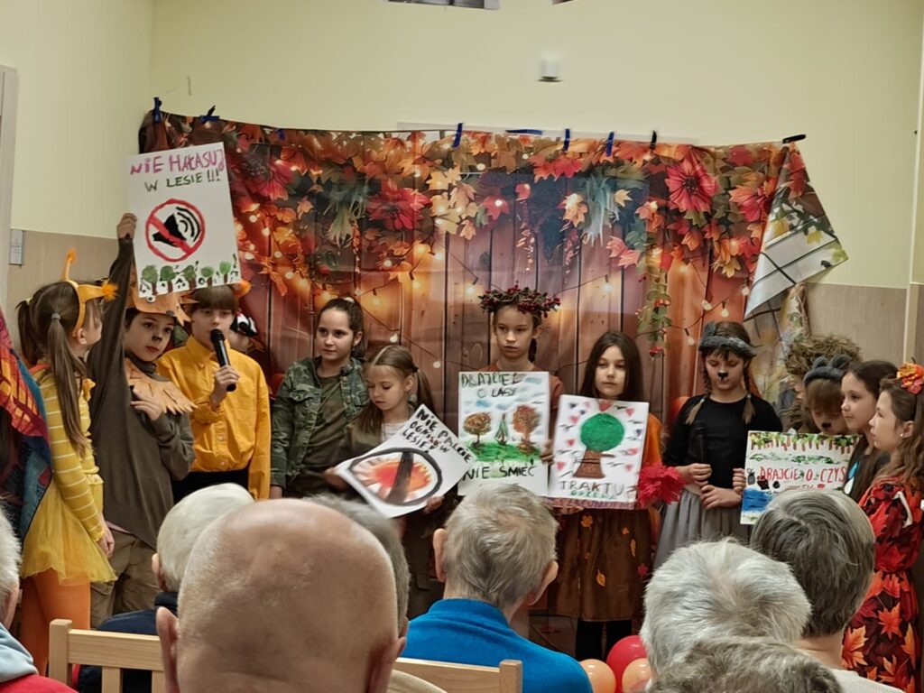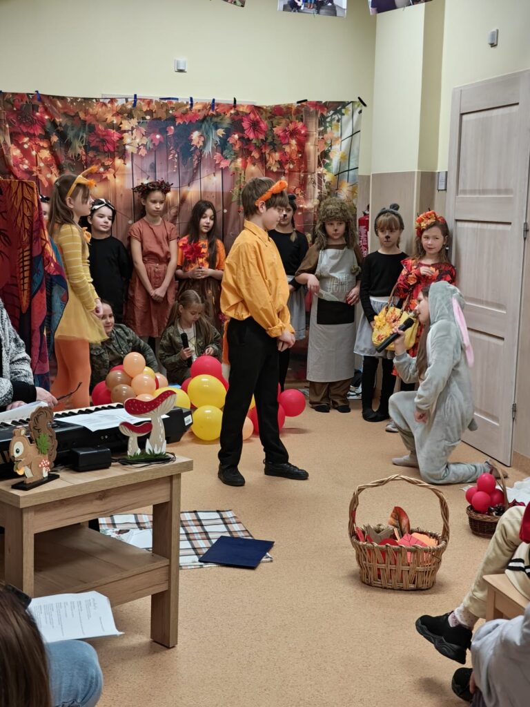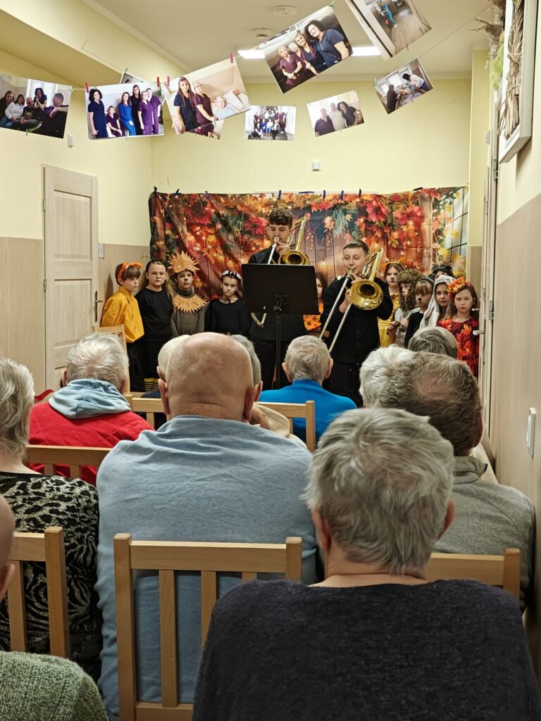 Mieliśmy super gości – młodych artystów, uczniów z klasy III a oraz wolontariuszy z Zespołu Szkół Muzycznych im. Stanisława Moniuszki w Wałbrzychu. To był strzał w 10. Obejrzeliśmy niesamowity teatrzyk jesienny pt. „Co słychać w lesie”, a także wysłuchaliśmy gry na puzonie dwóch uzdolnionych chłopców – Emila i Lucjana. Nasze dziewczyny kuchenne w zamian przygotowały słodki poczęstunek.